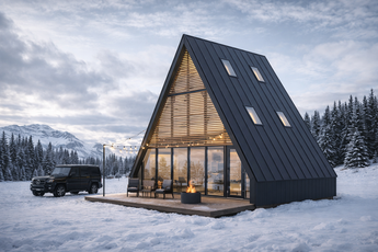 - Cabin A-frame con marcata silhouette triangolare e facciata vetrata panoramica