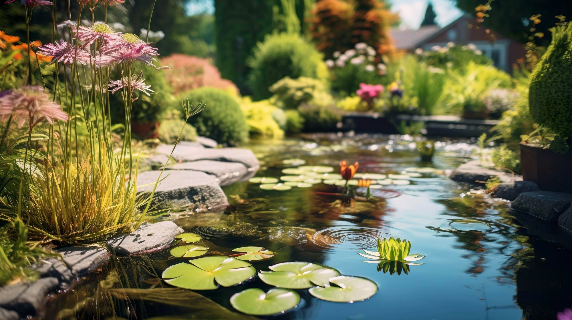 Water lilies and diverse plants enrich the ecosystem, combining ornamental beauty with ecological balance and a relaxing atmosphere.