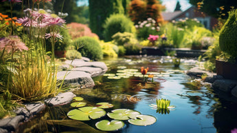 Built with stone edging and organic shapes, the pond integrates seamlessly into the garden, using natural materials for an authentic look.