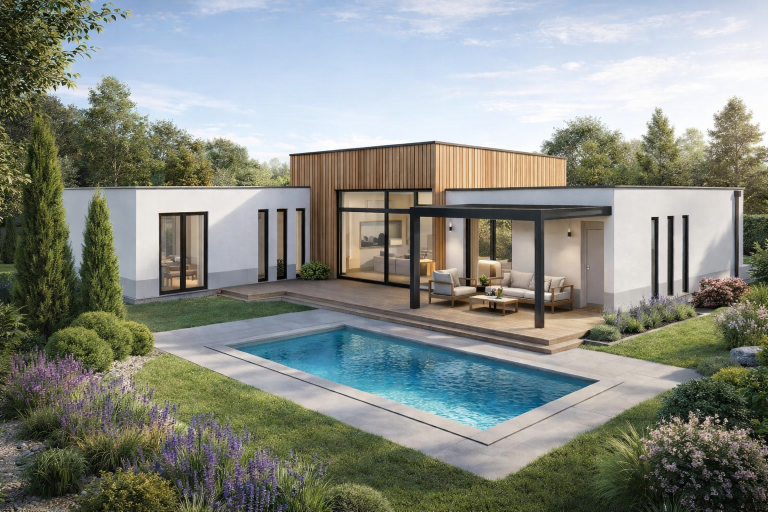 The L-shaped layout opens naturally to a future terrace, garden, or pool area.
