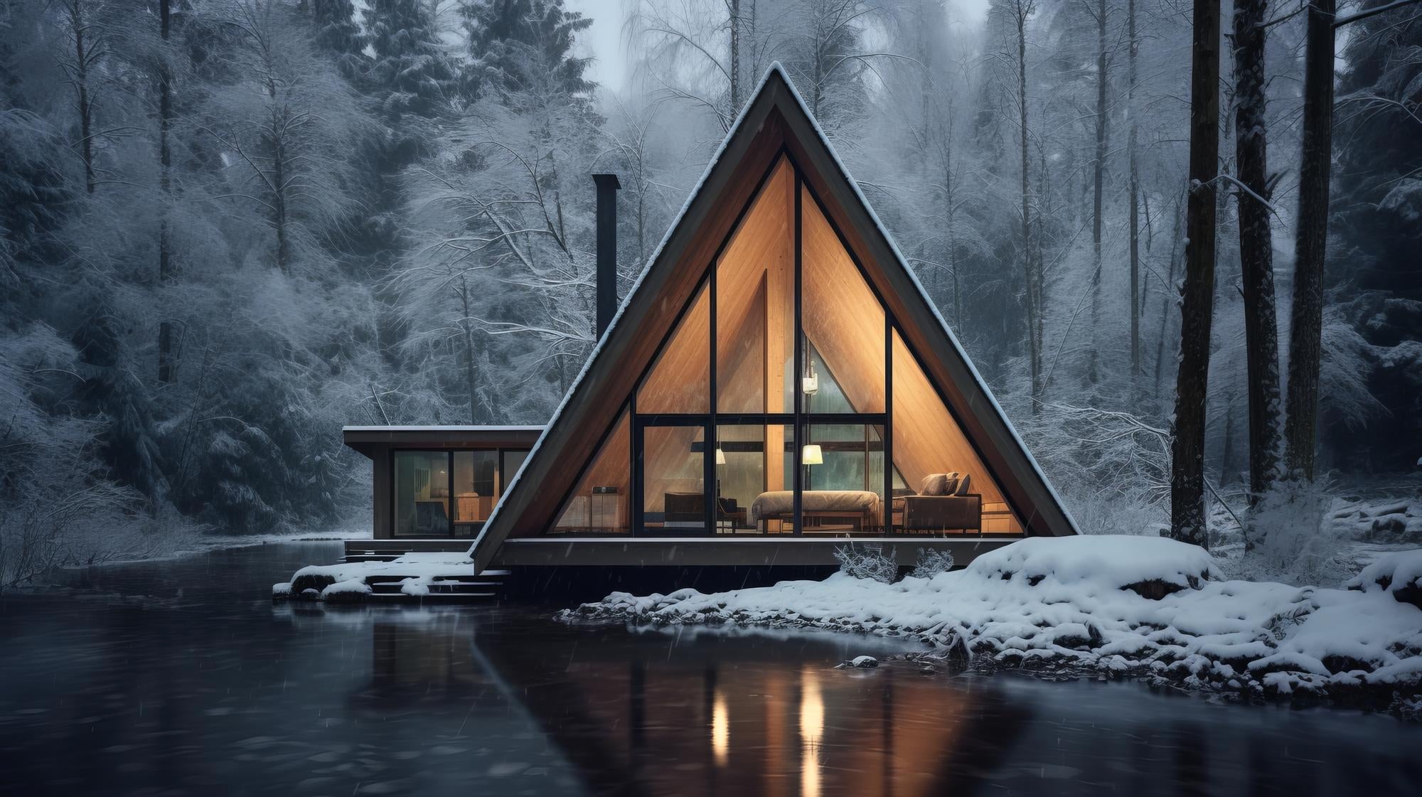 - A-frame cabin with striking triangular silhouette and panoramic glass façade